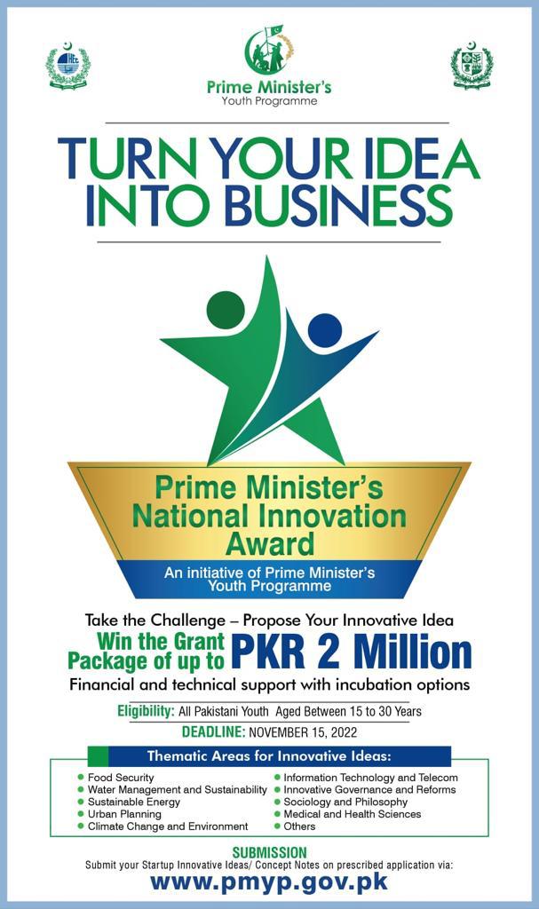 Prime Minister’s Youth Programme has announced National Innovation Award for the youth of Pakistan. It is an opportunity for young entrepreneurs (15-30 years) to present their innovative ideas related to eight thematic areas with a specific focus on Eco-Innovation and get a chance to win Rs. 2 million in grant funding along with technical support and incubation options. The selected ideas and teams will be engaged with the private sector and startup industry.