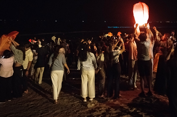 The highlight of the evening was the energetic Rang Competition, where alumni and students competed in a friendly and colorful showdown that filled the beach with laughter, excitement, and team spirit. The night concluded beautifully as lanterns lit up the sky and music set the perfect celebratory mood.