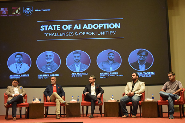 The event commenced with an opening address by the MBA Connect team, followed by an overview of artificial intelligence and its growing relevance across industries. A distinguished panel comprising Zeeshan Haider (CEO, Dipitt), Farrukh Nadeem (COO, TCS), Adil Mushtaq (CPO, Engro Corporation), Naveed Ahmed (Director Supply Chain, Reckitt), and Azeem Yaseen (CTO, Paysys Labs) shared insights on the current state of AI adoption in their respective sectors.